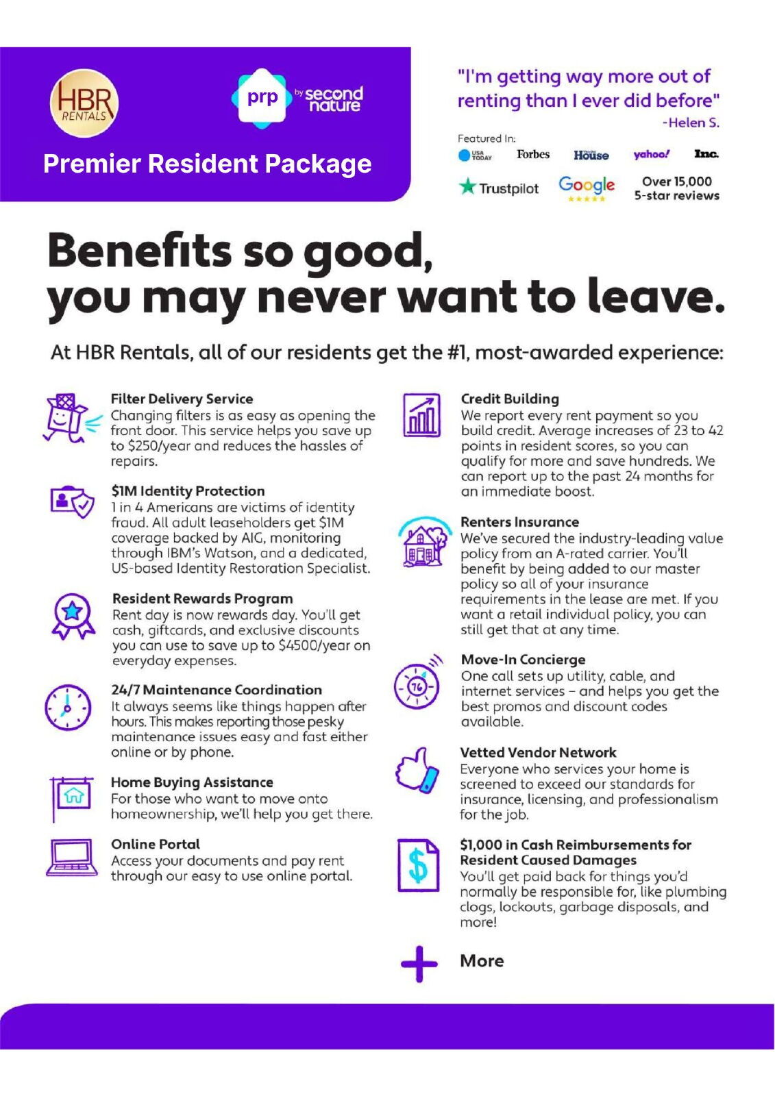 All HBR Rentals residents are enrolled in the Premier Resident Package (PRP) for $50.95/month, which includes renters insurance, HVAC air filter delivery (for applicable properties), credit building, $1M identity protection, move-in concierge services, resident rewards program, and additional details provided upon application.
