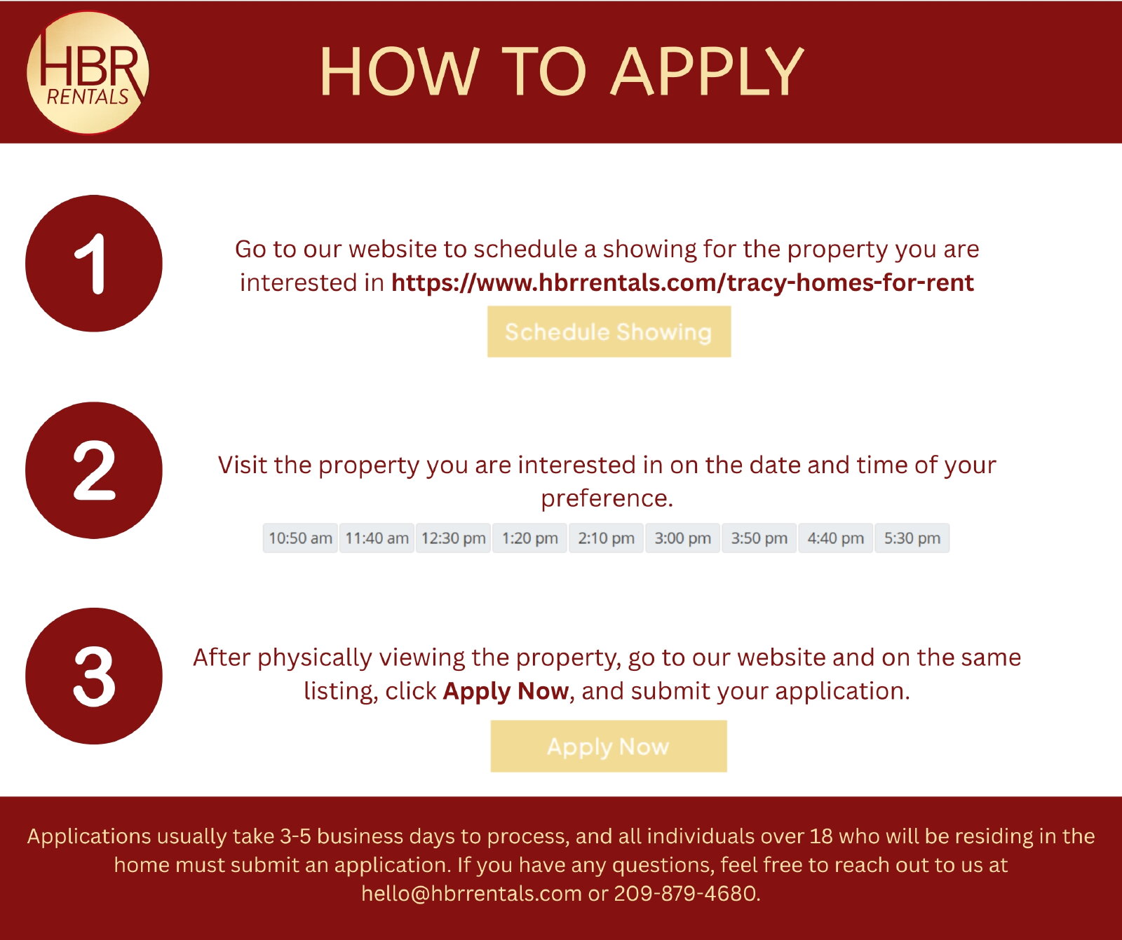 For the fastest service, please visit hbrrentals.com/tracy-homes-for-rent, find the property, click “SCHEDULE A SHOWING,” and request your preferred viewing time.